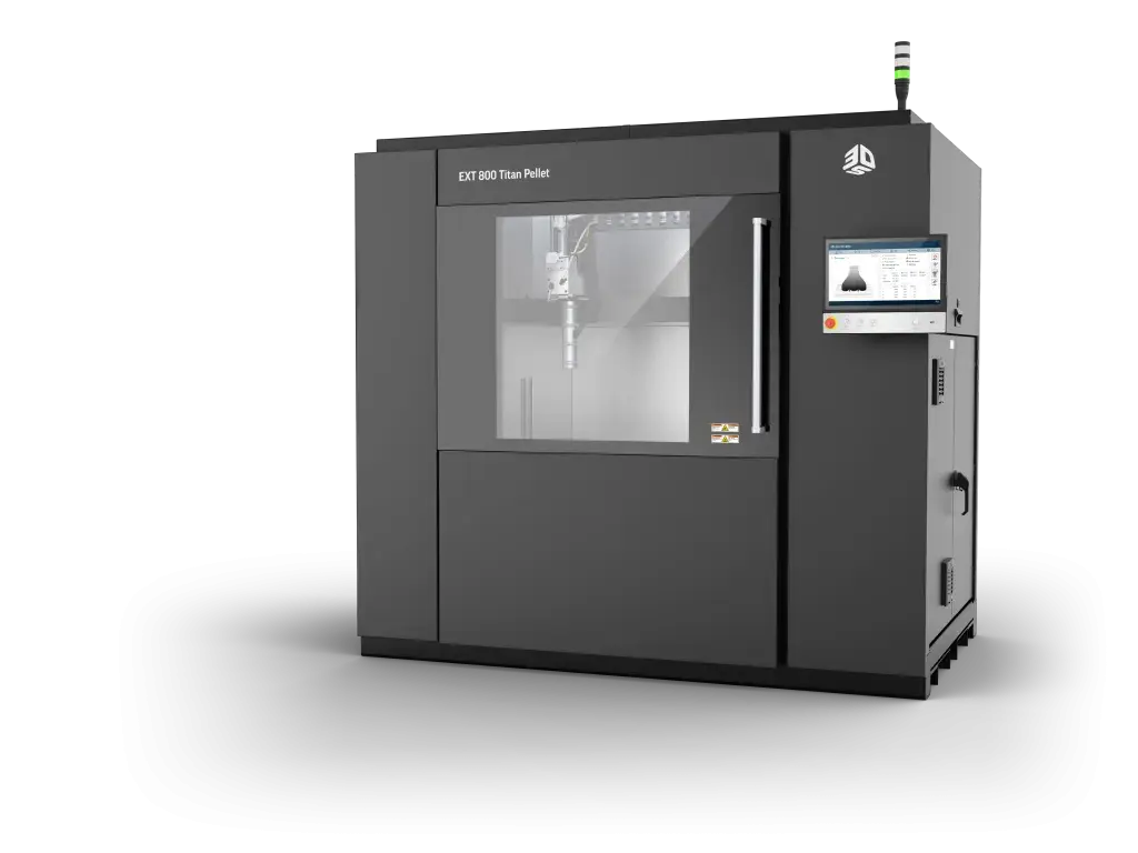 Der EXT 800 Titan Pellet verfügt über einen einzigen Extrusions-Werkzeugkopf und ein weiterentwickeltes Design. Das System eignet sich daher ideal für eine breite Palette von Fertigungsumgebungen, darunter Büros, Labore und Universitäten sowie größere Werkshallen. Aufgrund des kompakten Rahmens passt der Drucker durch eine Standard-Doppeltür, was die Lieferung und Installation erleichtert. Zum System gehört außerdem ein großer Touchscreen an der Vorderseite, der eine intuitive Benutzererfahrung bietet.